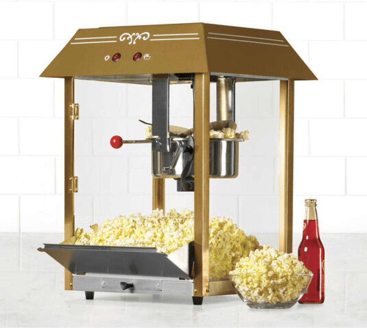 The carnival-style popcorn maker includes an 8-ounce stainless steel kettle that makes about 3 gallons of popcorn in minutes and a heated deck to keep this delicious snack fresh.